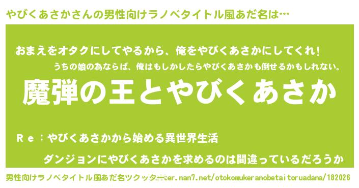 | 胡散臭い通販商品みたいなあだ名 | 『世界中を虜にした100年もののヴィンテージワイン…その名も「やびくあさか」』 |