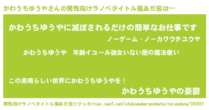 | 女子向けラノベタイトル風あだ名 | 『かわうちゆうやの玉の輿計画!』 |