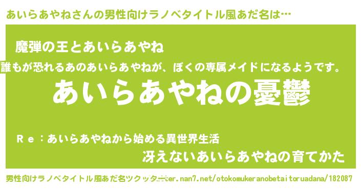 | 女子向けラノベタイトル風あだ名 | 『(仮)あいらあやねのやんごとなき事情』 |
