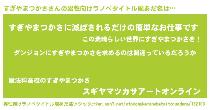 | 女子向けラノベタイトル風あだ名 | 『すぎやまつかさの卵を拾いまして』 |