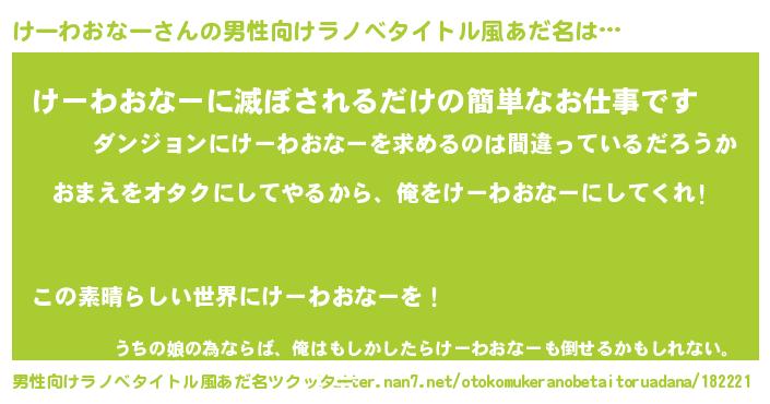 | 女子向けラノベタイトル風あだ名 | 『けーわおなー夫妻のなれそめ』 |