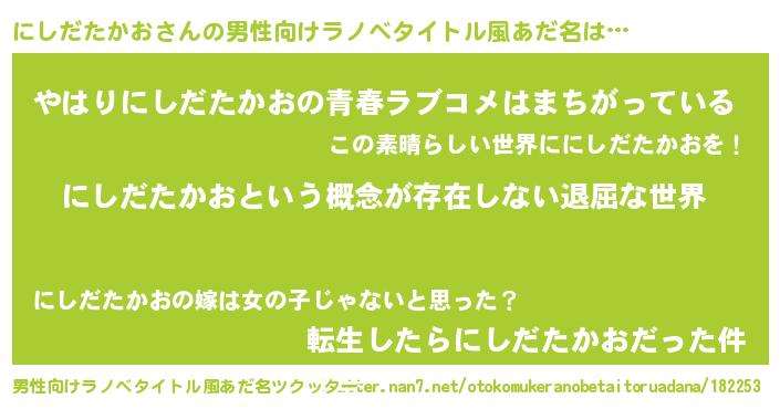 | 女子向けラノベタイトル風あだ名 | 『異世界で失敗しない100のにしだたかお』 |