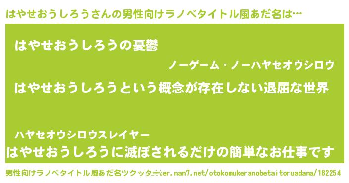 | 女子向けラノベタイトル風あだ名 | 『異世界で失敗しない100のはやせおうしろう』 |