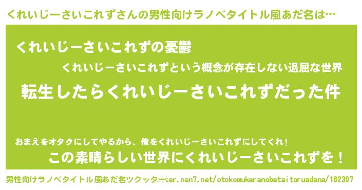 | 女子向けラノベタイトル風あだ名 | 『くれいじーさいこれずの玉の輿計画!』 |