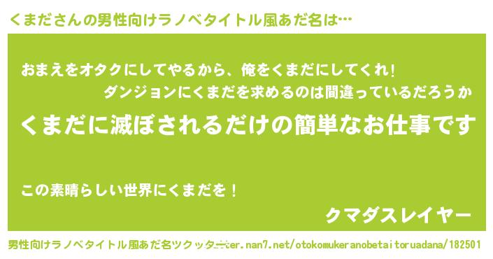 | ヒーロー風カッコイイあだ名 | 『慈愛の使者くまだ』『暗黒騎士クマ』 |