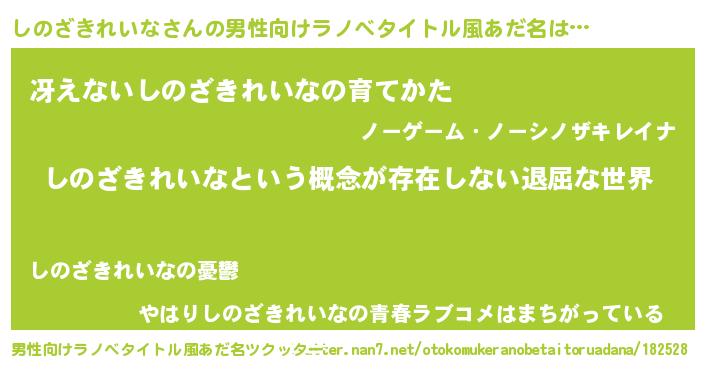 | 女子向けラノベタイトル風あだ名 | 『異世界で失敗しない100のしのざきれいな』 |