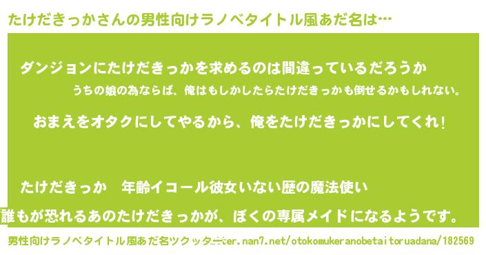 | 女子向けラノベタイトル風あだ名 | 『たけだきっか夫妻のなれそめ』 |