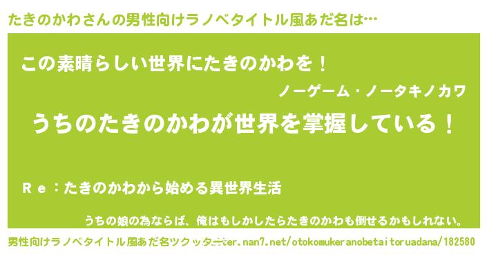| ヒーロー風カッコイイあだ名 | 『仮面タキダー』『天空の使者たきのかわ』 |