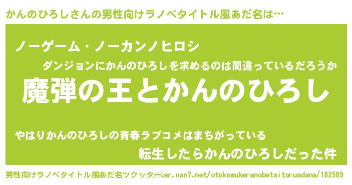| 女子向けラノベタイトル風あだ名 | 『かんのひろしが死なない童話 林檎のかんのひろしの診療簿』 |