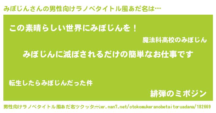 | 胡散臭い通販商品みたいなあだ名 | 『あなたにだけ特別に提供する100年もののヴィンテージワイン…その名も「みぼじん」』 |