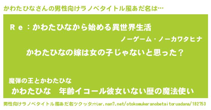 | 女子向けラノベタイトル風あだ名 | 『かわたひな様がみてる』 |