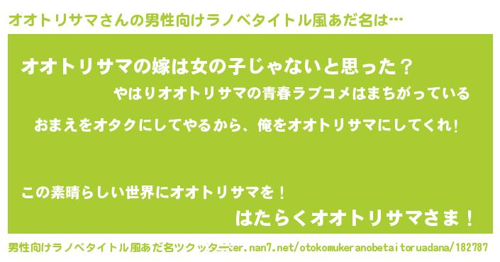 | 女子向けラノベタイトル風あだ名 | 『オオトリサマ夫妻のなれそめ』 |