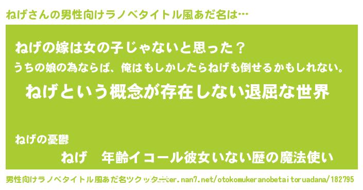 | 女子向けラノベタイトル風あだ名 | 『ねげの契約王妃』『ねげ様がみてる』 |