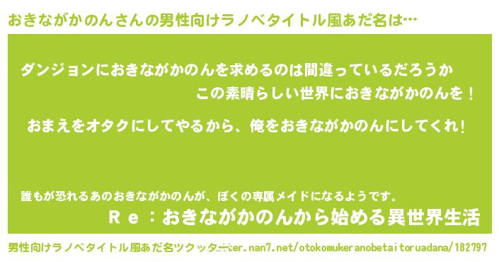 | 女子向けラノベタイトル風あだ名 | 『おきながかのん夫妻のなれそめ』 |