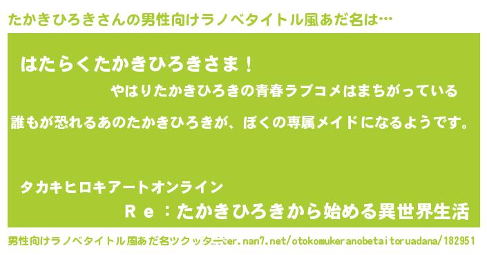 | 女子向けラノベタイトル風あだ名 | 『異世界でカフェたかきひろきを開店しました。』 |