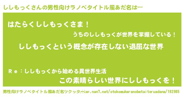 | 女子向けラノベタイトル風あだ名 | 『異世界で失敗しない100のししもっく』 |