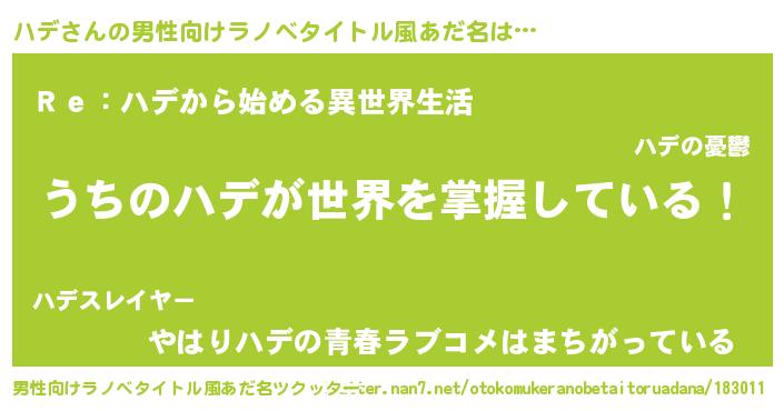 | 女子向けラノベタイトル風あだ名 | 『男装ハデの憂鬱な任務』『闇のハデ』 |
