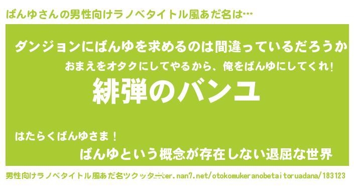 | 胡散臭い通販商品みたいなあだ名 | 『信頼と実績のサプリメント…その名も「ばんゆ」』 |