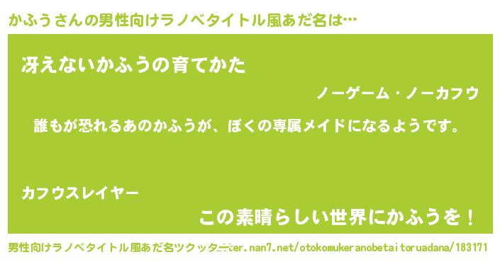 | 胡散臭い通販商品みたいなあだ名 | 『前代未聞の健康食品…その名も「かふう」』 |