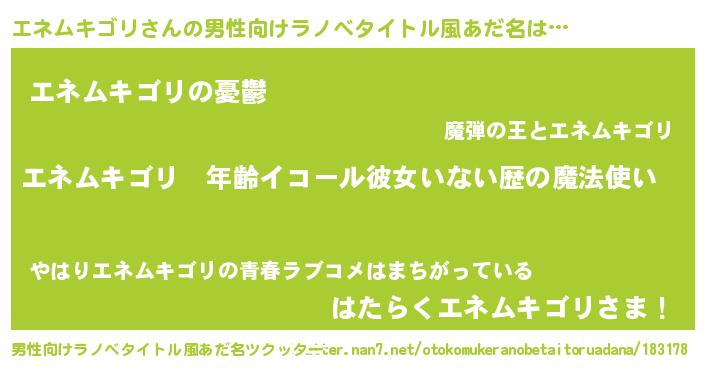 | 女子向けラノベタイトル風あだ名 | 『エネムキゴリの玉の輿計画!』 |