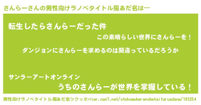 | 女子向けラノベタイトル風あだ名 | 『さんらーの卵を拾いまして』 |