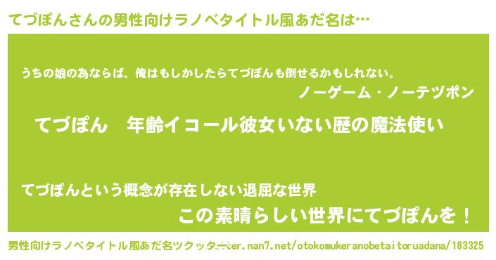 | 女子向けラノベタイトル風あだ名 | 『てづぽんの玉の輿計画!』 |