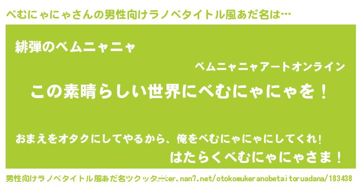 | 女子向けラノベタイトル風あだ名 | 『悪役べむにゃにゃに転生したようですが、知った事ではありません』 |