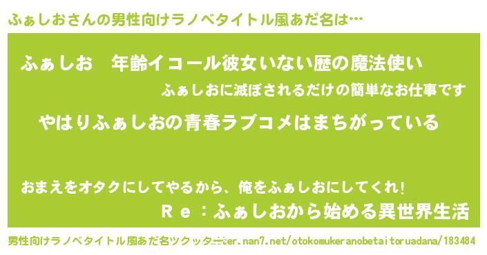 | 女子向けラノベタイトル風あだ名 | 『ふぁしお伯爵の花嫁』『闇のふぁしお』 |