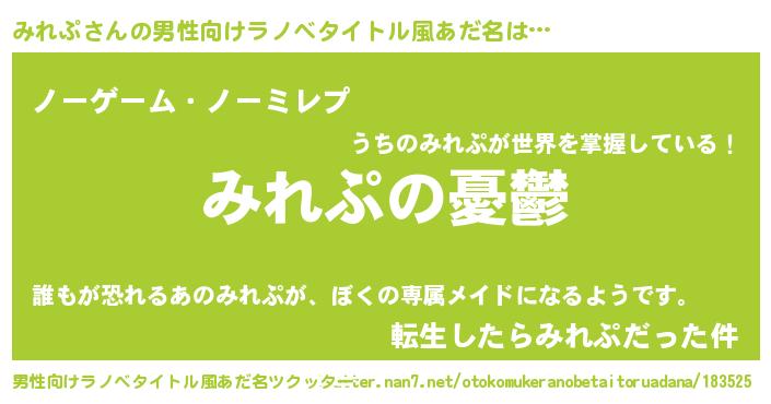 | 女子向けラノベタイトル風あだ名 | 『(仮)みれぷのやんごとなき事情』 |