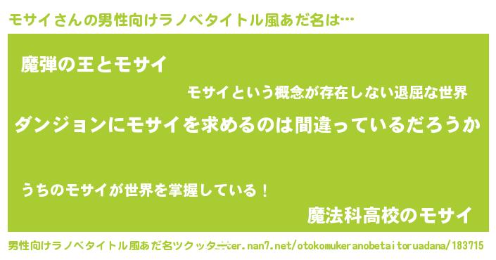 | 胡散臭い通販商品みたいなあだ名 | 『信頼と実績のサプリメント…その名も「モサイ」』 |