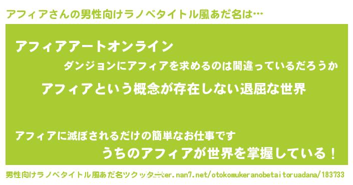 | 女子向けラノベタイトル風あだ名 | 『異世界で失敗しない100のアフィア』 |