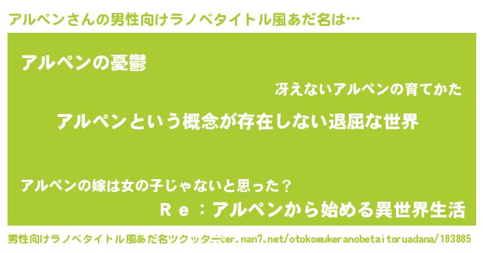 | 女子向けラノベタイトル風あだ名 | 『異世界で失敗しない100のアルペン』 |