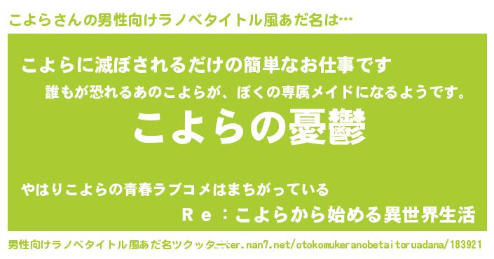 | 女子向けラノベタイトル風あだ名 | 『(仮)こよらのやんごとなき事情』 |