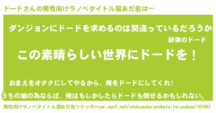| 女子向けラノベタイトル風あだ名 | 『悪役ドードに転生したようですが、知った事ではありません』 |