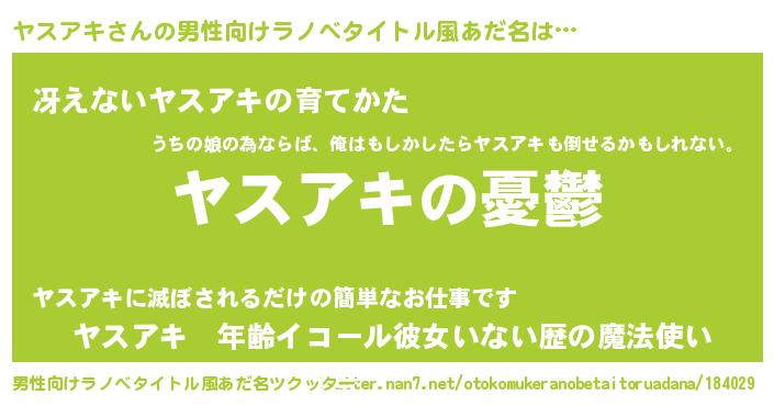 | 女子向けラノベタイトル風あだ名 | 『(仮)ヤスアキのやんごとなき事情』 |