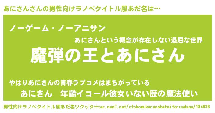 | 女子向けラノベタイトル風あだ名 | 『あにさんが死なない童話 林檎のあにさんの診療簿』 |