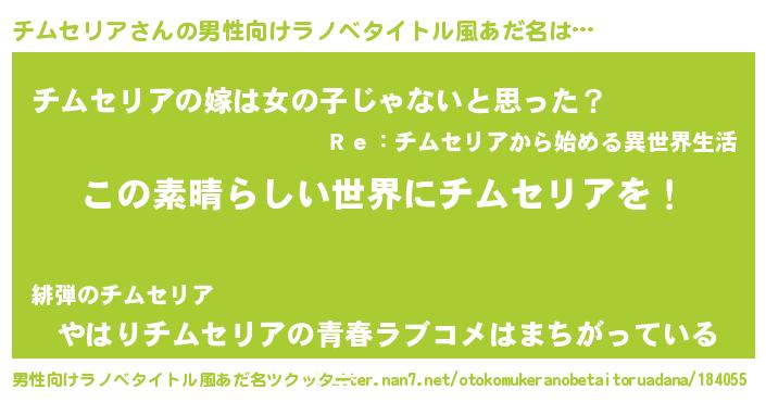 | 女子向けラノベタイトル風あだ名 | 『乙女ゲームの破滅フラグしかない悪役チムセリアに転生してしまった…』 |