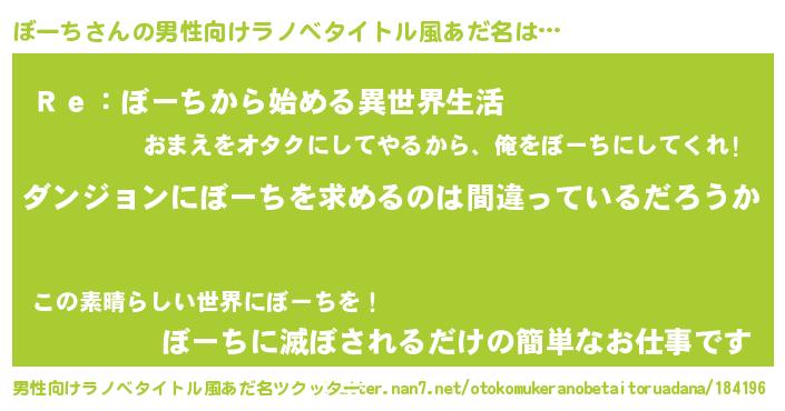 | 女子向けラノベタイトル風あだ名 | 『ぼーちは平凡を望む』『闇のぼーち』 |