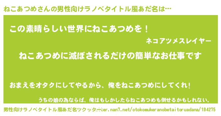 | 胡散臭い通販商品みたいなあだ名 | 『あなたにだけ特別に提供する100年もののヴィンテージワイン…その名も「ねこあつめ」』 |