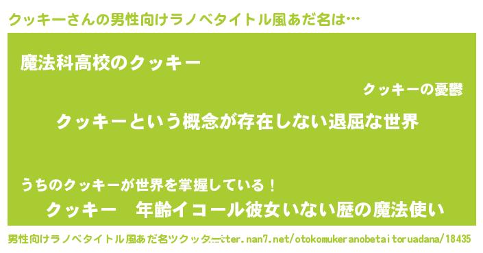 | 女子向けラノベタイトル風あだ名 | 『異世界で失敗しない100のクッキー』 |