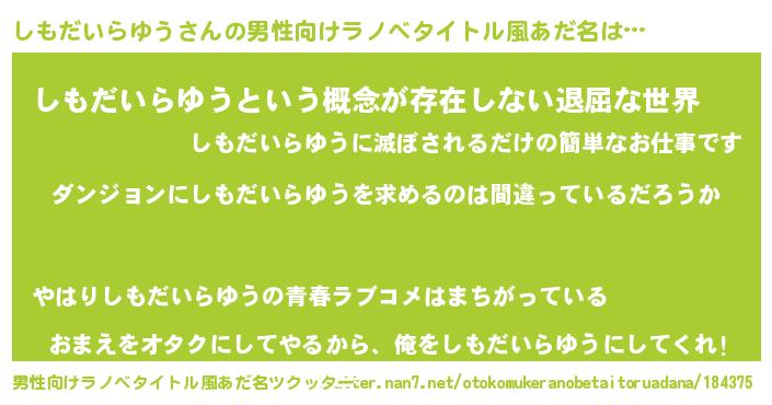 | 胡散臭い通販商品みたいなあだ名 | 『信頼と実績のペンダント…その名も「しもだいらゆう」』 |