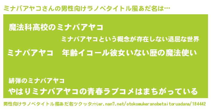 | 女子向けラノベタイトル風あだ名 | 『ミナバアヤコの玉の輿計画!』 |
