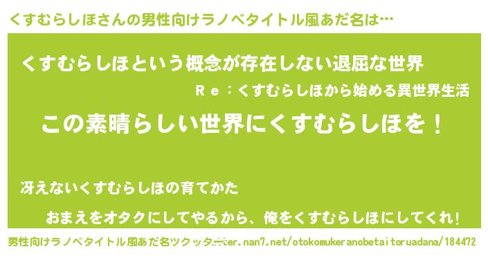 | 女子向けラノベタイトル風あだ名 | 『乙女ゲームの破滅フラグしかない悪役くすむらしほに転生してしまった…』 |