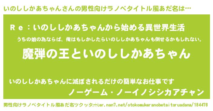 | 女子向けラノベタイトル風あだ名 | 『いのししかあちゃんが死なない童話 林檎のいのししかあちゃんの診療簿』 |