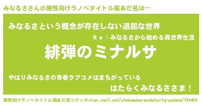 | 女子向けラノベタイトル風あだ名 | 『シンデレラみなるさ家の靴箱館』 |