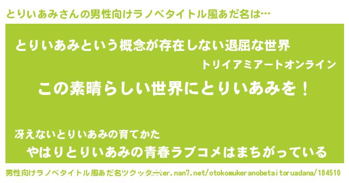 | 女子向けラノベタイトル風あだ名 | 『乙女ゲームの破滅フラグしかない悪役とりいあみに転生してしまった…』 |