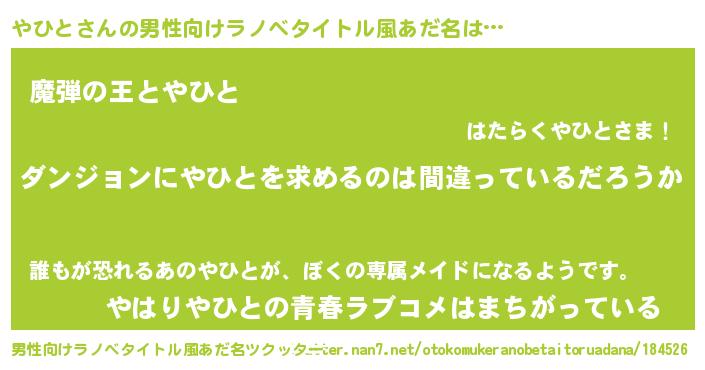 | 女子向けラノベタイトル風あだ名 | 『やひとの卵を拾いまして』 |