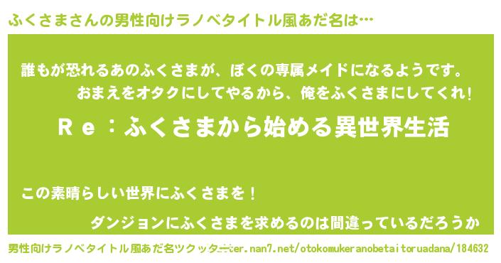 | 意味不明あだ名 | 『自称ふくさま』『永久保存ふくさま』 |