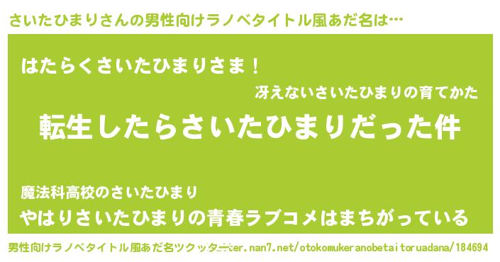 | 女子向けラノベタイトル風あだ名 | 『さいたひまりの玉の輿計画!』 |