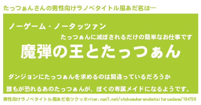 | 女子向けラノベタイトル風あだ名 | 『乙女ゲームの破滅フラグしかない悪役たっつぁんに転生してしまった…』 |